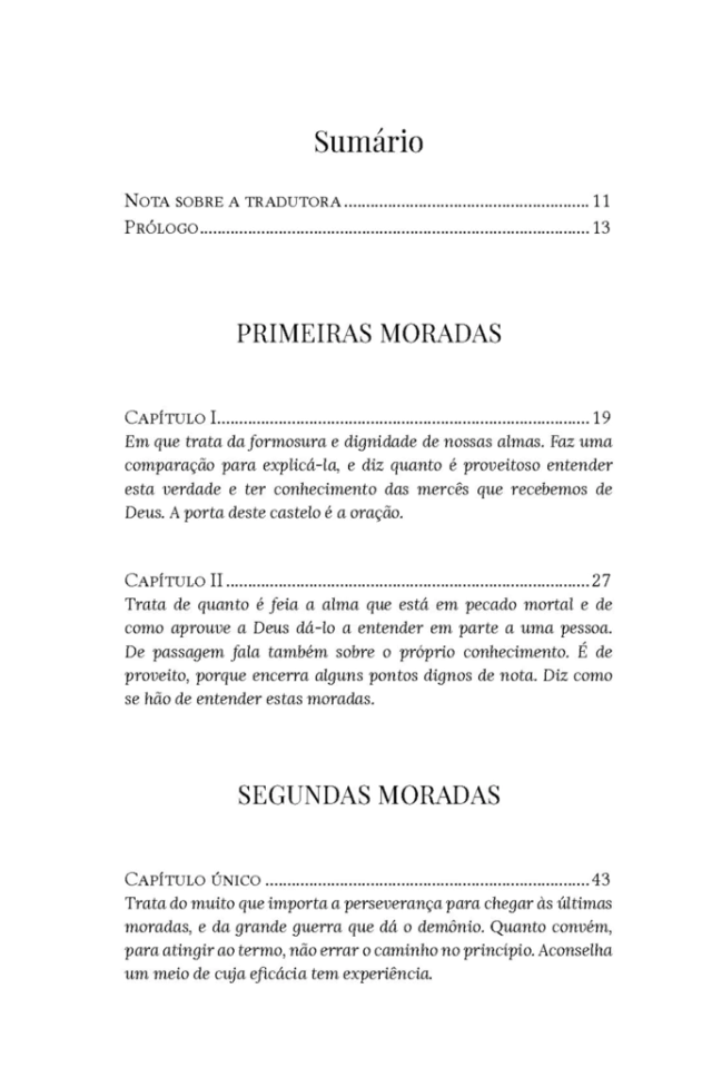 Em Castelo Interior, clássico da literatura mística, Santa Teresa revela o caminho que conduz a alma ao interior de si mesma e que leva à união íntima com Deus. Somente Ele pode unir a alma a Si e santificá-la, e o faz quando e como quer. Nosso papel é apenas ser dóceis e estar sempre prontos para cumprir Sua Vontade. Este livro poderá nos esclarecer como fazer a nossa parte e a confiar na atuação de Deus na nossa alma.