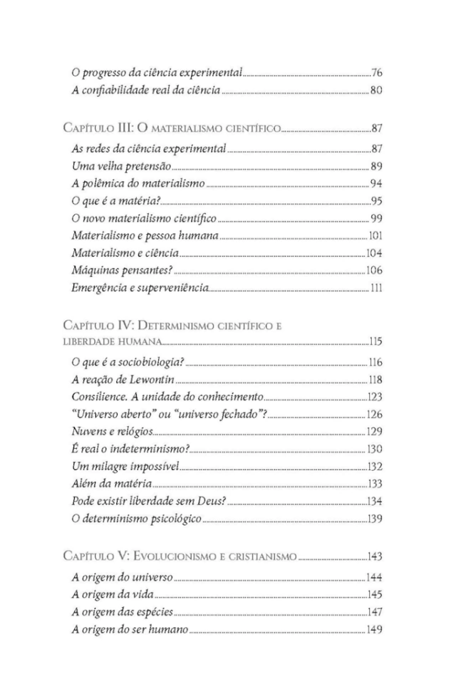 Neste livro, Mariano Artigas trata, de modo claro e ordenado, dos principais temas que tocam a ciência e a religião: o caso Galileu, a relação entre o cristianismo e o desenvolvimento da ciência moderna, a confiabilidade da ciência, o materialismo científico, a inteligência artificial, a sociobiologia, o determinismo versus a liberdade, o evolucionismo, os limites da ciência, a verdade científica e, por fim, a colaboração entre ciência e religião. Além disso, traz amplos comentários sobre diversos bestsellers científicos.
